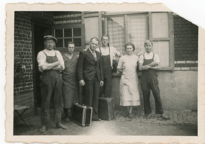 Achiel Floré beslist in 1941 om te gaan werken op een bloemisterij in Duitsland. Achiel hoopt er de nodige handelscontacten te leggen zodat ze rechtstreeks azalea's konden verkopen aan Duitse afnemers. De broers René en Vien brengen Achiel naar het Sint-Pietersstation van Gent per fiets. Hij werkt een jaar bij Himmelman aan de rand van Keulen. Via zijn contacten slaagde Achiel er in om bestellingen bij Duitse bloemisten te bemachtigen voor de aankoop van azalea's. Op de foto staat Achiel klaar voor vertrek met zijn valiezen. Van links naar rechts Boerke Naas, moeder Stefanie, Achiel, Gustaaf, Marie en Vien.