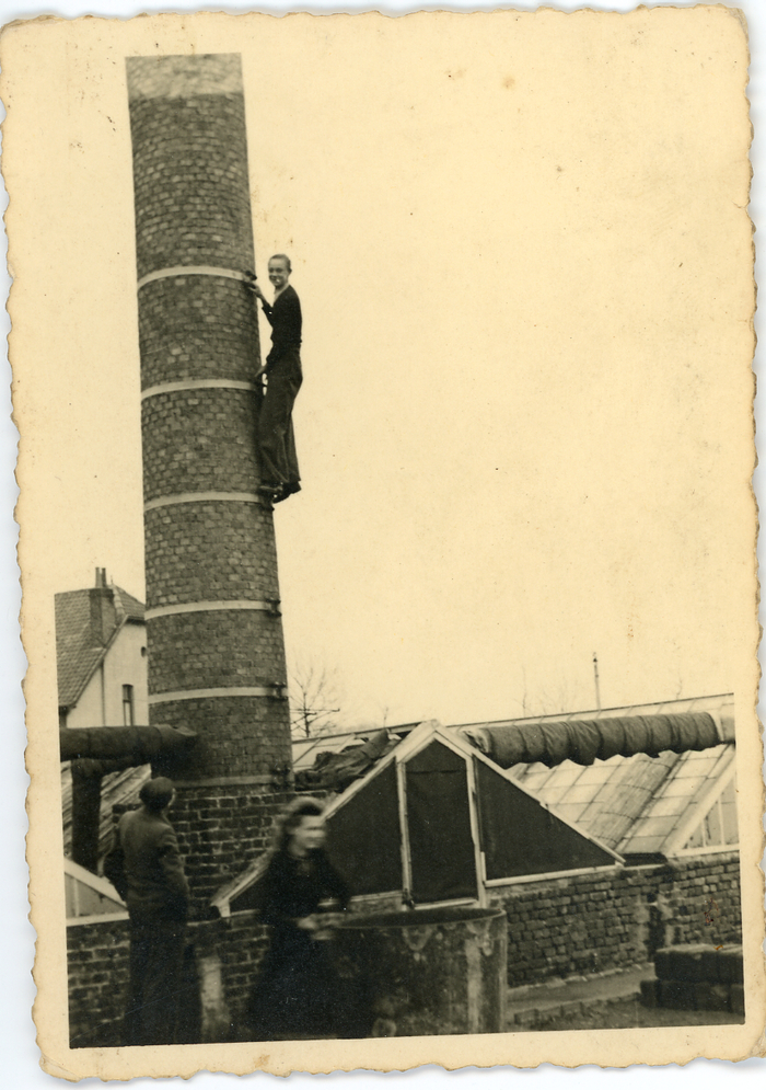 André Pieters klimt op de schouw van de bloemisterij. Zijn zus Simonne Pieters kijkt toe (onderaan rechts), figuur links is ongekend. De schouw staat aan het 'ketelkot' waar de kolenketel stond voor de verwarming van de serres. De verbindingsbuis tussen het ketelkot en de serres was ingepakt in terrepapier en stro om de buis te isoleren.