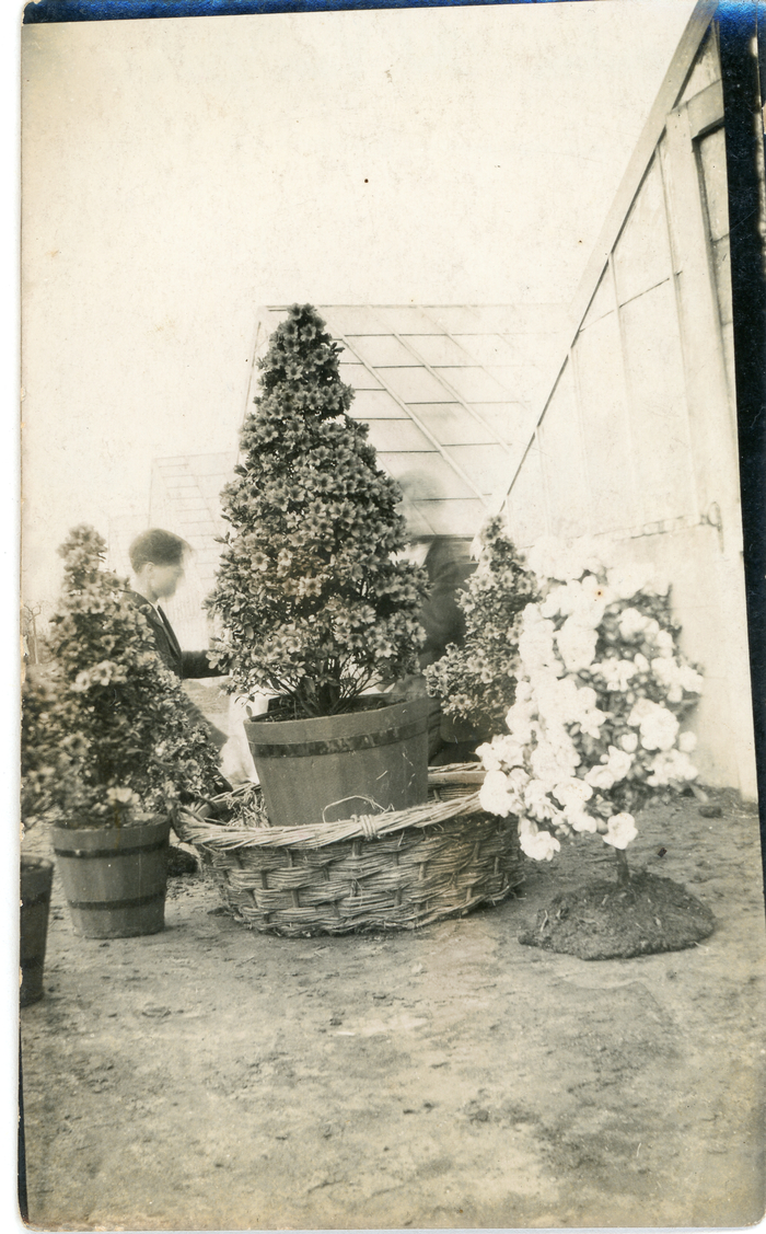 Hubert Van Hecke (zoon van Adolf) bij de azalea's. Ze staan in manden, klaar voor transport, waarschijnlijk naar de Floraliën Gent. De azalea's werden zowel in pot vertoond als in de volle grond.