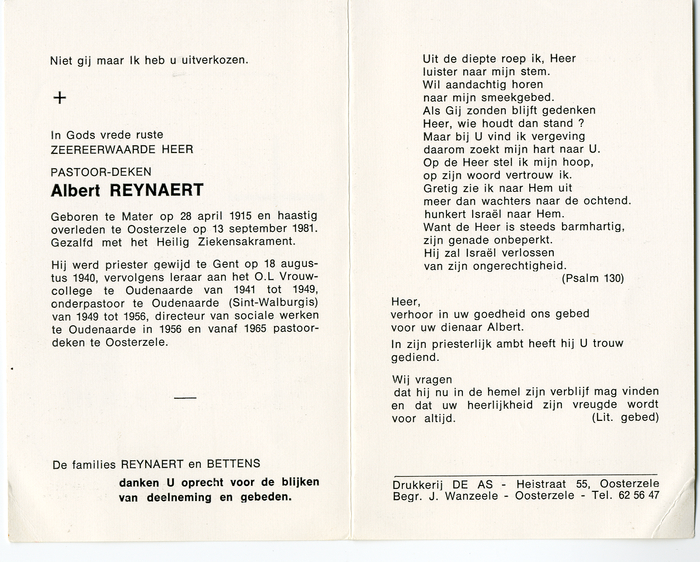 Bidprentje van deken Albert Reyaenert. Hij was geboren in 1915 en gestorven in 1981. Vanaf 1965 was hij pastoor-deken in Oosterzele.