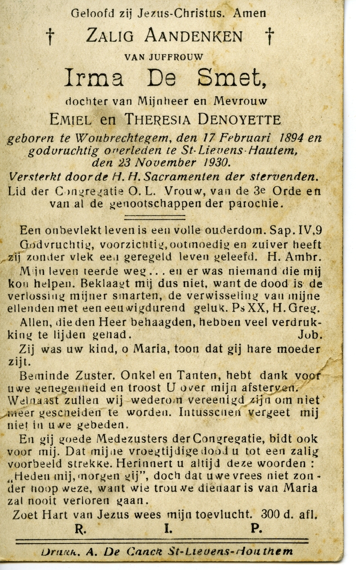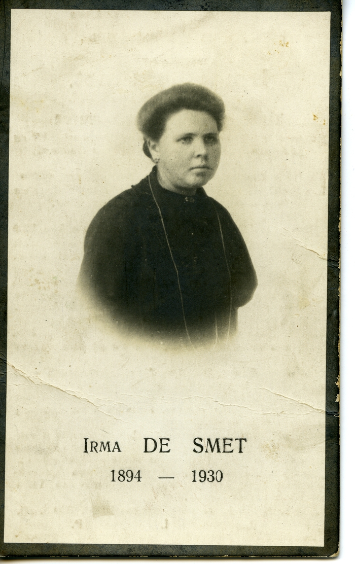 Irma De Smet is geboren te Woubrechtegem op 17 februari 1894. Zij overleed te Sint-Lievens-Houtem op 23 november 1930.