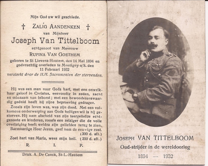 Bidprentje van Joseph Van Tittelboom, geboren op 14 mei 1894 te Sint-Lievens-Houtem, gestorven op 11 februari 1932 te Montigny Sur Sambre. Oud-Strijder in de Eerste Wereldoorlog.