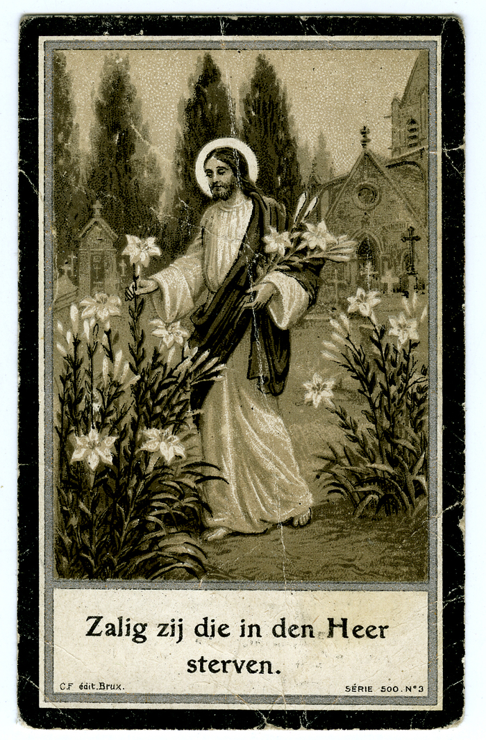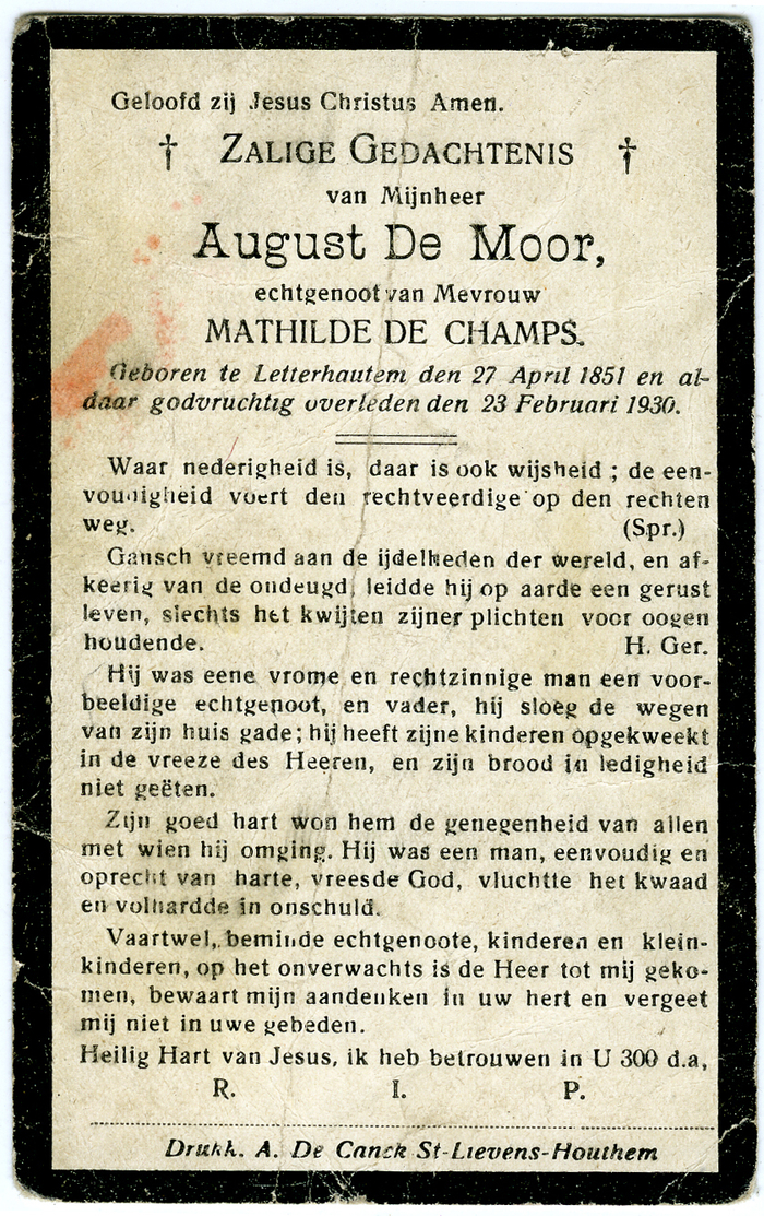 Zalige Gedachtenis van Mijnheer August De Moor, echtgenoot van Mevrouw Mathilde De Champs. Geboren te Letterhautem den 27 April 1851 en aldaar godvruchtig overleden den 23 Februari 1930.