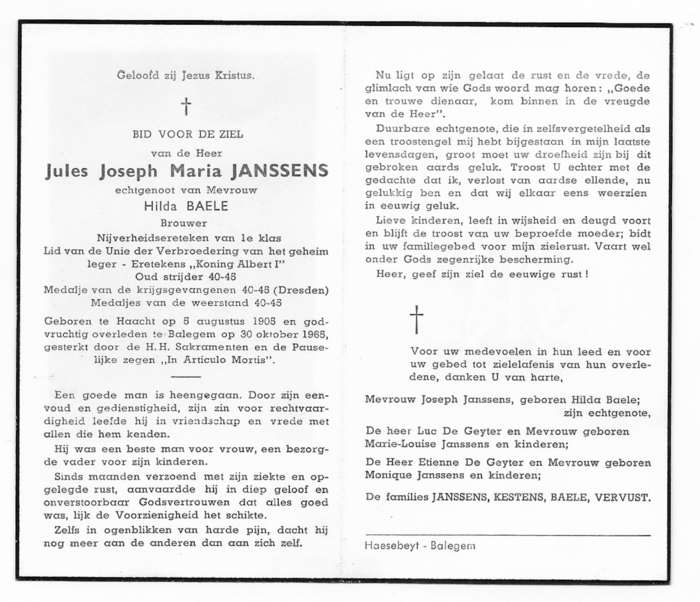 Bidprentje van (Jules) Joseph JANSSENS, ° Haacht, 05.08.1905, † Balegem, 30.10.1965. Was brouwer van het nog steeds beroemde "Spitfire" bier. Brouwerij was gevestigd op het Dorp te Balegem