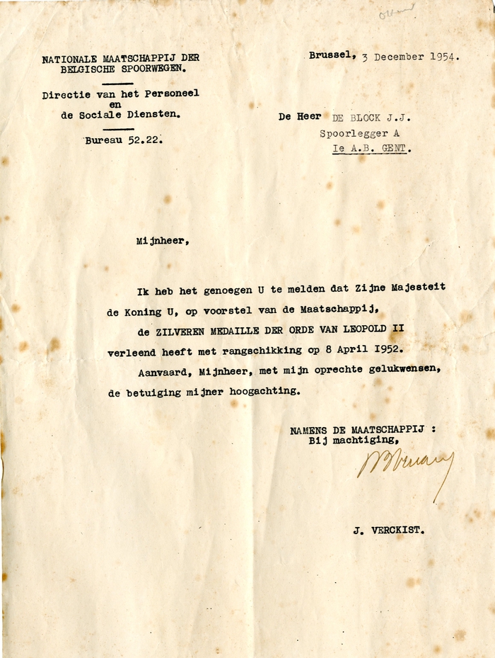 Brief van de NMBS aan Julien De Block met de melding dat zijn Majestei de Koning heeft ingestemd om Julien een ereteken te verlenen.