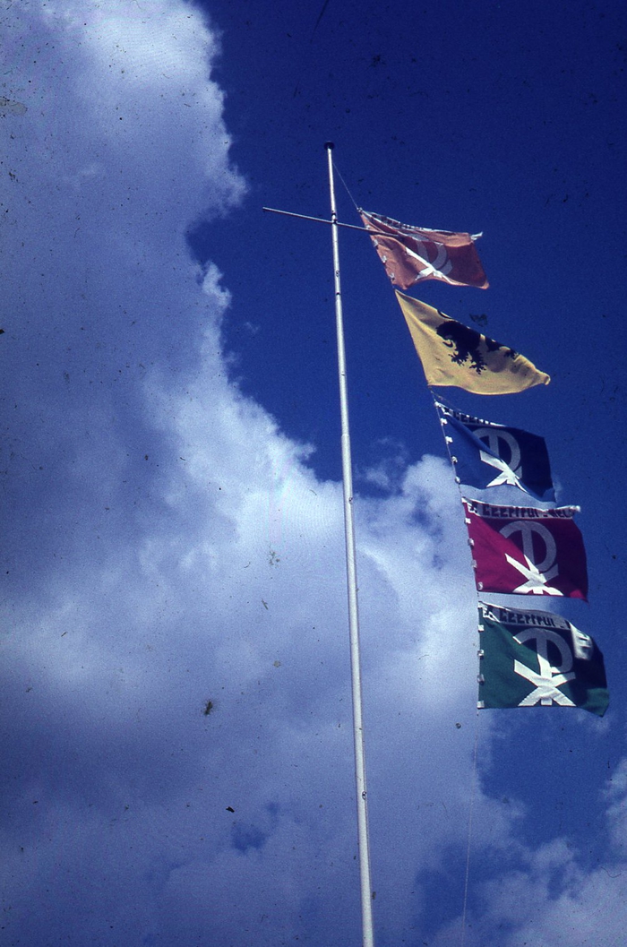 Kamp chiro Melle Geertrui in Genk, 1966. Op de foto ziet u de vlaggen wapperen in de wind.