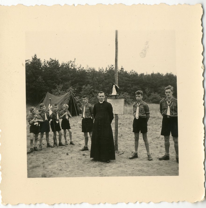 De proost E.H Verhaeghe houdt een moment van bezinning bij een Mariabeeldje dat aan de vlaggemast is bevestigd, Genk, 1957.