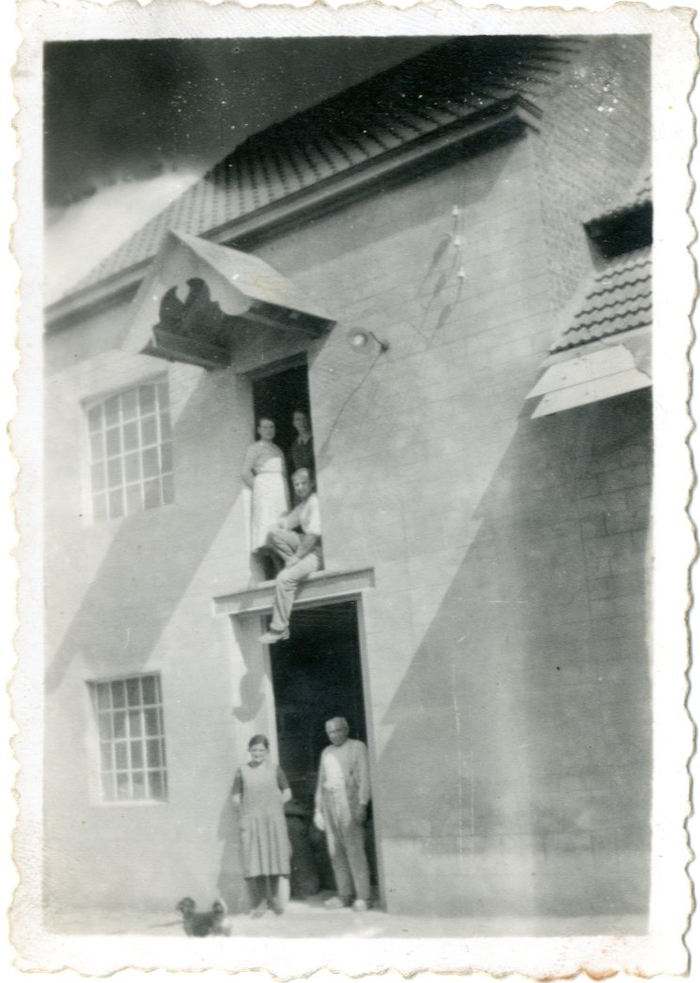 Constantin Pycke en zijn familie voor het gebouw van de watermolen, Bavegem, ca. 1920