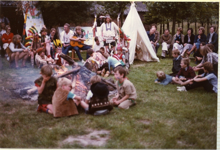Sjamfoeters en speelclub spelen cowboy en indiaan tijdens het kampvuur op klein kamp samen met de ouders, Mater, 1979.