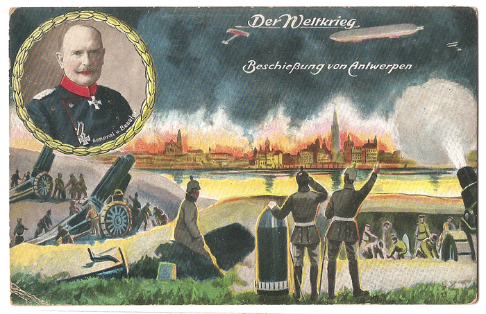 Belegering van de stad Antwerpen door de Duitsers in 1914. Op 10 oktober na hevige gevechten gaf de stad zich over aan de vijand.