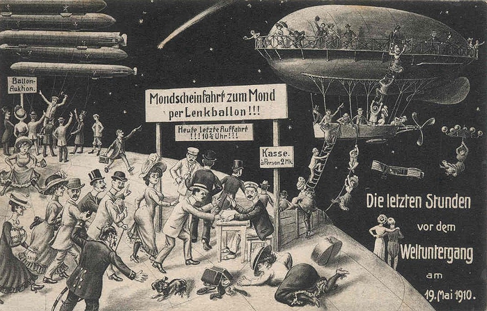 Spotprent waarbij de panische angst van de Duitse bevolking voor het einde van de wereld wordt afgebeeld. Enkele uren voor de wereld vergaat proberen ze met een zeppelin te vluchten en het noodlot te vermijden.