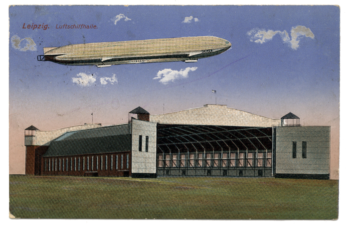 Een dubbele zeppelinloods in het Duitse Leipzig in 1915. De luchtschepen bevonden zich meestal per twee in reusachtige hangars van zo'n 180 m lang, 50 m breed en 25 m hoog.