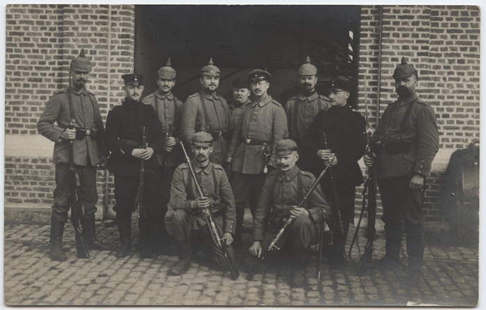 Duits officier met sabel, tussen zijn soldaten, Melle, wereldoorlog I, 1914- 1918.