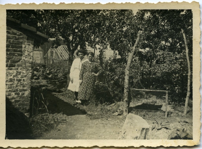 Emma Van Damme (rechts) en Maria Westelinck (links) met witte schort van de wasserij waar ze werkte, Roskamstraat 7 Merelbeke, 1942. Op de achtergrond schade aan de serre van Julien Volckaert vanwege de bommen tijdens de Tweede Wereldoorlog.