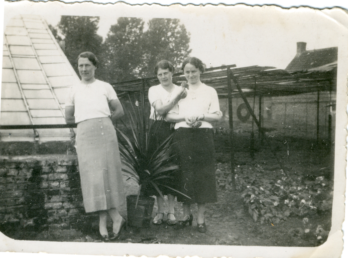 Hilda en Elsa Puimège op de bloemisterij. De bloemsterij was van ongeveer 1916 tot 1947 actief en was overgenomen van Louis Van Acker en Placida Schepens.