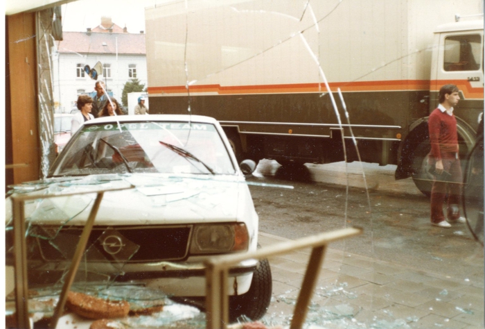 Een Opel rijdt frontaal op de vitrine van bakkerij De Paepe. Omstreeks 9u30 werd de bakkerij opgeschrikt door dit ongeluk.