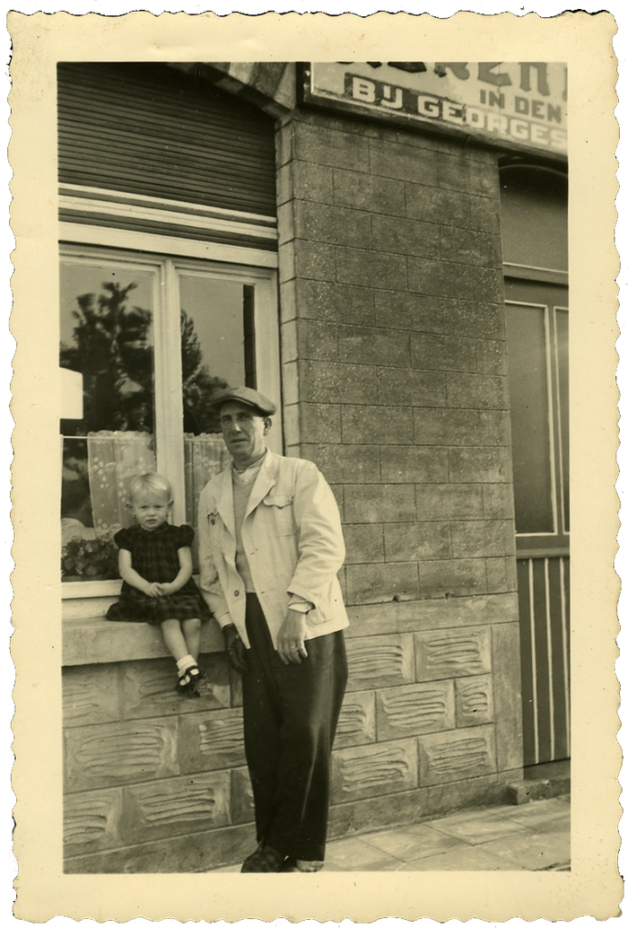 Georges Van Meldert, uitbater van café "Den drieling" met zijn dochter. Georges kreeg de bijnaam "den éénarm" aangezien hij maar één arm had. Er werd in dit huis café gehouden van 1888 tot 1955. In 1899 werden er drie kinderen geboren. Vandaar dat het café de naam "den drieling" kreeg. Van 1955 tot 1976 verhuisde het café naar de Houwestraat 3.