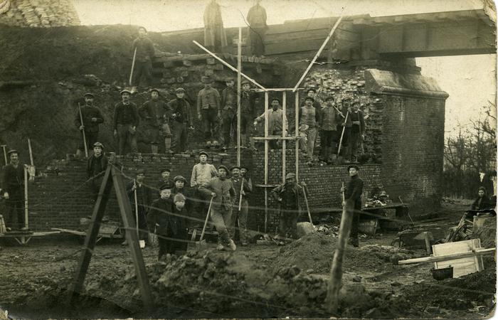 Groep opgeëisten voeren herstellingswerken uit aan een brug in Erwetegem, Zottegem. Rechts vooraan staat August Iemants.