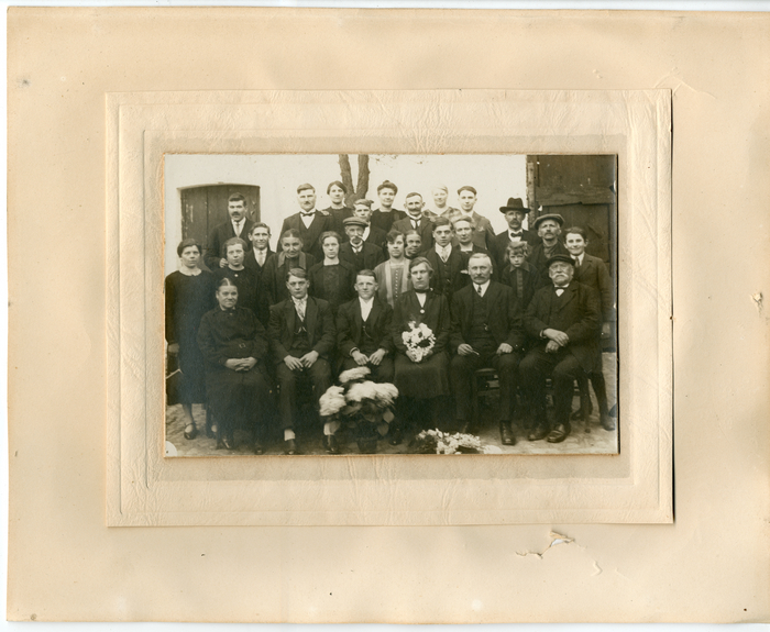 Groepsfoto van het huwelijk van Eleuthère Steurbaut en Emma Van Bever, genomen door fotograaf G. De Moor in Oosterzele circa 1925.
