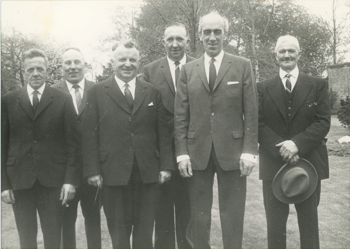 Groepsfoto tijdens de viering van twintig jaar burgermeesterschap van Jean De Schrijver. Van links naar rechts: Michel De Clercq, F. Geers, O. Schoonjans, Adolf 't Jampens, burgermeester Jean De Schrijver en Cyriel Van Zele.