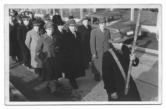 Optocht ter herdenking van een of andere gebeurtenis uit het recent verleden. Op de eerste rij ,in militair uniform, achter de vlaggendrager: Daniël Van Cauwenberge. Op de achtergrond, links van de stoet, de toenmalige "champetter".