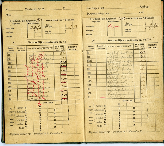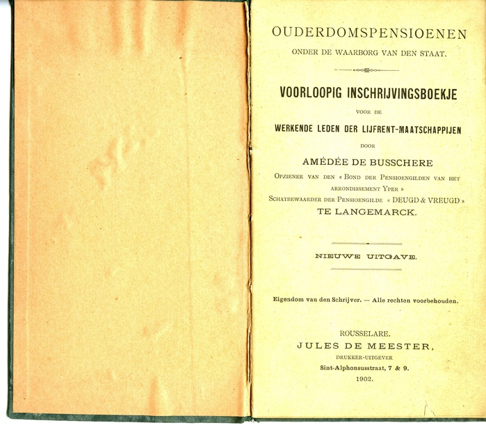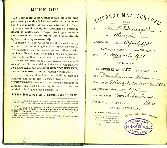 Voorlopig inschrijvingsboekje van Emma Maria Faes voor de werkende leden der lijfrent-maatschappijen van de pensioenkas De Fledericusgilde uit Vlierzele.
