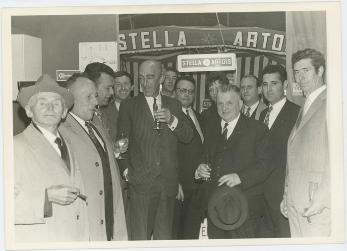 Foto jaarbeurs middenstand in Lochristi (1971). In het midden: burgemeester Jean De Schryver en Hilaire Schoonjans.