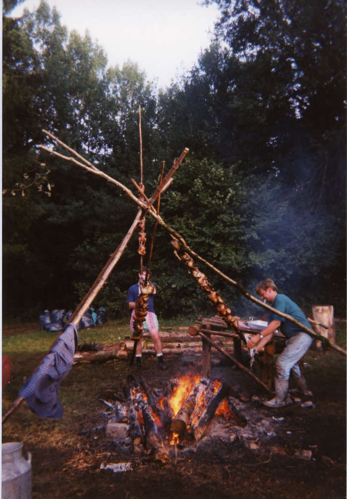 Kip aan 't spit op kamp van chiro Geertrui, Gembes, 1994
