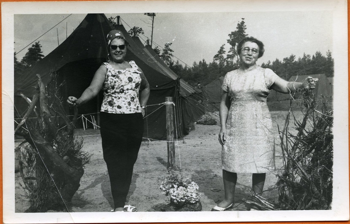 Marietje en Bertje bij de ingang van de reftertent. Zij kookten op de kampen van chiro Melle Scheldering.
