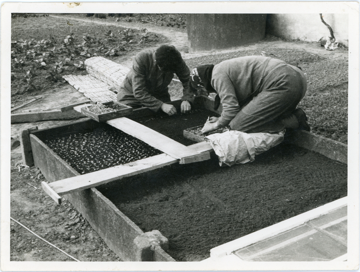 Kweek van tabaksplanten op boomkwekerij De Moor in Oosterzele. Verschillende tabaksplanten werden op de boomkwekerij gekweekt om als rookwaren te verkopen nadat ze gedroogd werden. De beste soorten werden geselecteerd. Op de achtergrond ligt ook de rietmat waarmee de planten beschermd werden tegen bv. de koude of hitte.