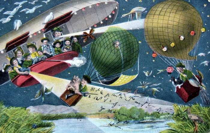 Fantasierijke voorstelling van kinderen in een zeppelin en luchtballonnen.
