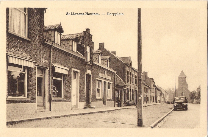 Daarnaast was café Paerwijck. Mr. Paerwijck ging in de kerk met de schaal rond. Meestal zonder schaal, gewoon in de hand, dat ging gemakkelijker om zich tussen de stoelen te wringen. Was soms een hele bedoening. Daarnaast café August De Mulder en daarnaast de firma Stevens (Eternit). De arbeiders zitten voor de deur. Ook bij De Riemacker namen de dochters (Christiane,Suzanne, Liliane en Eliane) 's zomers, iedere avond hun stoel naar buiten.