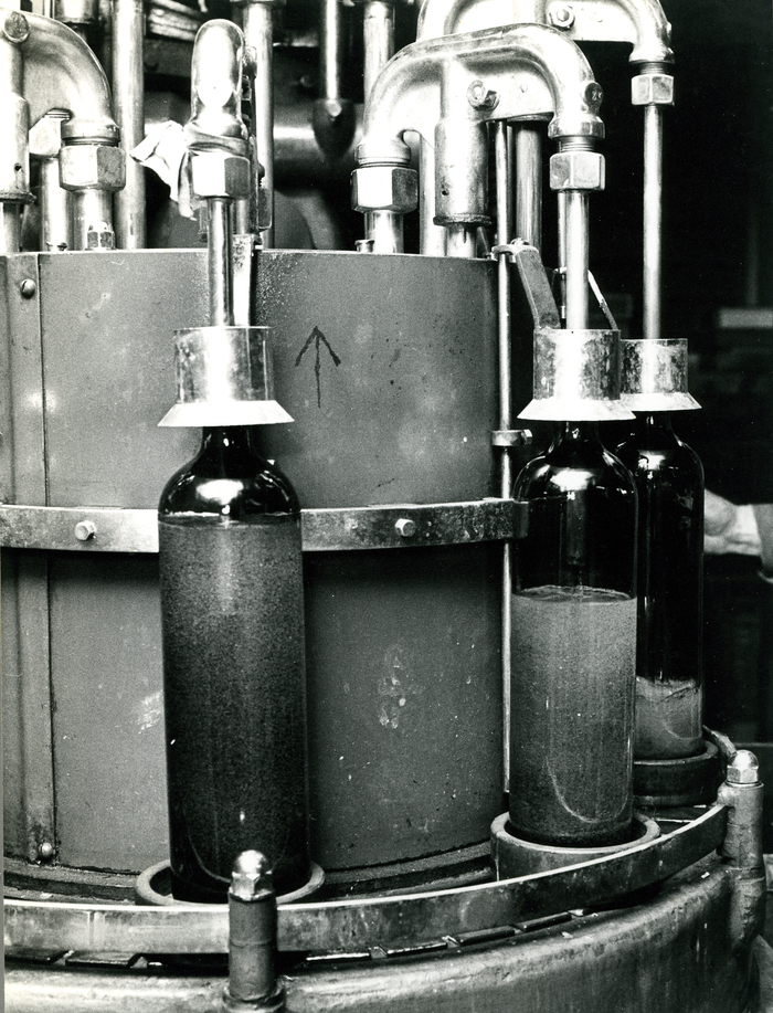 Moderne flessenvulmachine, stokerij Van Damme, Balegem, 1978