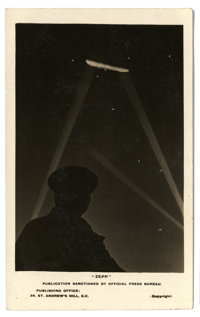 Nachtelijke zeppelin gevat in schijnwerper, 1915