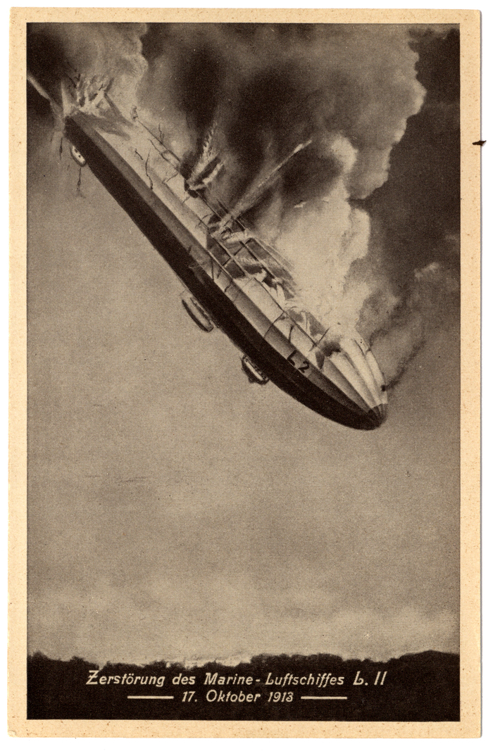 Een kunstenaarsimpressie van het neerstorten van de marinezeppelin L II op 17 oktober 1913.