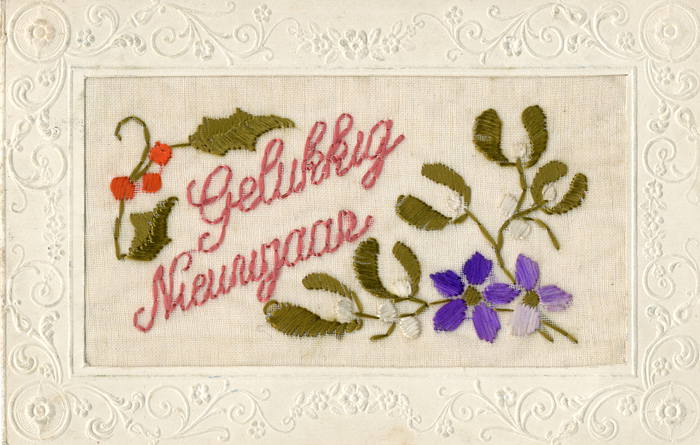 Kaart met 'gelukkig Nieuwsjaar' en borduursels.