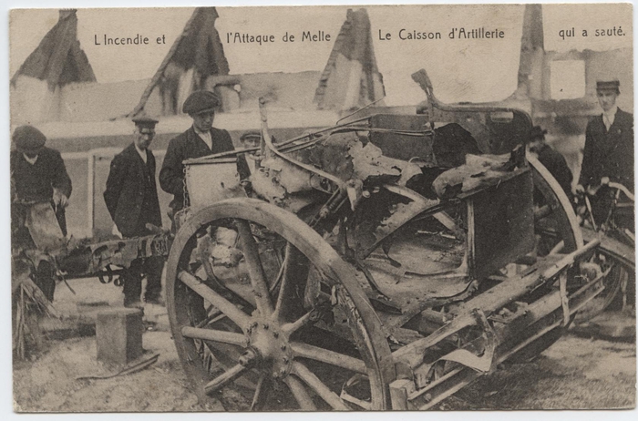 Ontploft artilleriestuk van het Belgische leger, Melle, 1914-1918. Zoals vele dorpen en steden bleef ook Melle niet gespaard van het oorlogsgeweld tijdens de Eerste Wereldoorlog. In 1914 waren er in de omgeving van Kwatrecht tweemaal ernstige confrontaties met de Duitse troepen met vele slachtoffers als gevolg, zowel onder de militairen als de burgerbevolking.