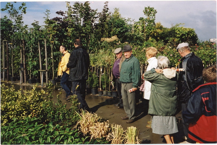Rondleiding op de boomkwekerij De Moor tijdens 'Op de Siertoer', georganiseerd door de provincie Oost-Vlaanderen. De bezoekers nemen een kijkje op het bedrijf en bezoeken de containers met sierbomen. Helemaal in het zwart is Laurent De Moor.