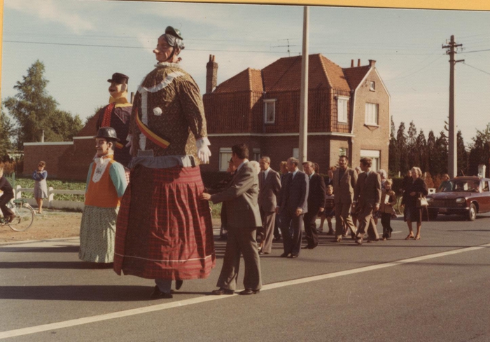 Waarschijnlijk was dit de stoet naar het gemeentehuis van Destelbergen. Sooike loopt tussen zijn moeder ‘Louise’ en vader ‘Dorus’. Ze worden gevolgd door heel wat mensen die opgekleed zijn voor de gelegenheid.