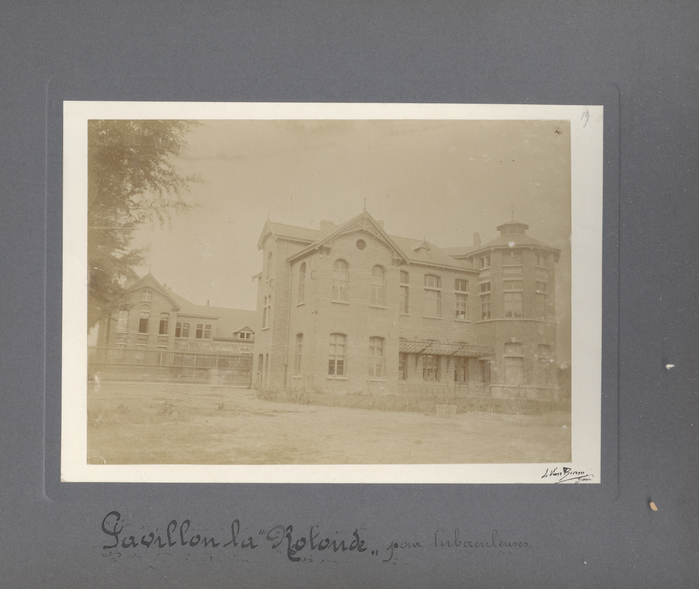 Paviljoen 'La Rotonde' van psychiatrisch centrum Caritas. Het paviljoen lag naast 'La Montagne', ook zichtbaar op de foto. Het paviljoen was speciaal opgevat voor de opvang van mensen met TBC. De ruimtes waren aangepast door hoge plafonds en een veranda voor het 'luchten'. Foto genomen kort na de bouw van de instelling, die afgerond was rond 1911.