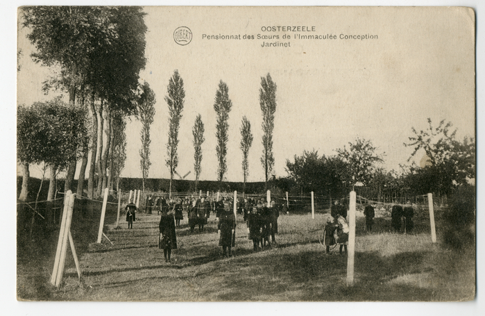 Postkaart met foto van de kinderen in de tuin van het Pensionnat des Soeurs de l'Immaculée Conception te Oosterzele, in 1923.