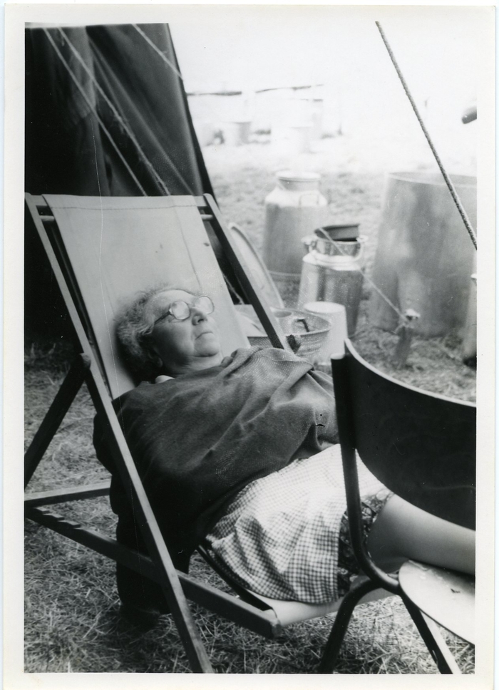 Kookmoeder Bertje rust even uit aan de kooktent op kamp.