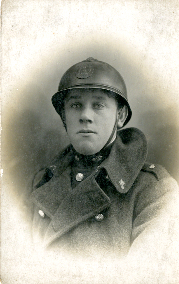 Portret van een soldaat met helm tijdens Eerste Wereldoorlog, details onbekend