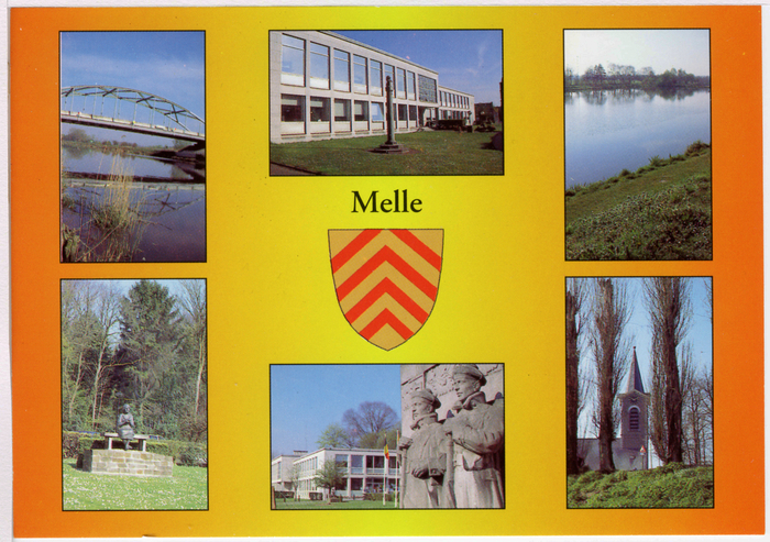 Kleurpostkaart van Melle. Met wapenschild en foto's van de brug over de Schelde, het gemeentehuis, de Schelde, standbeeld van de Franse vlootfuseliers en de Sint Martinuskerk.