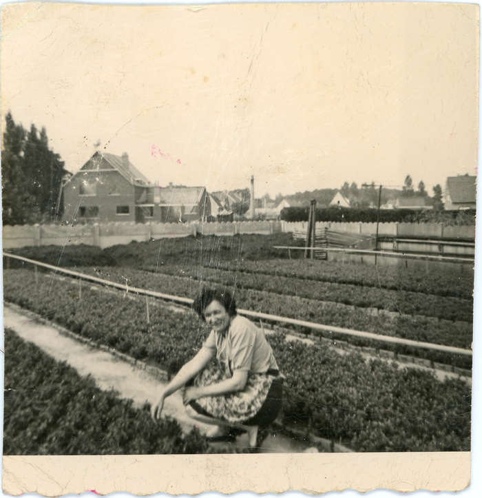 Rachel Braeckman op de bloemisterij Roggeman in de jaren 1950. Rondom liggen de perken met azalea's. In de jaren 1940 stierf André Roggeman. Zijn vrouw en kinderen namen de bloemisterij over in de vroegere Zandstraat in Heusden.