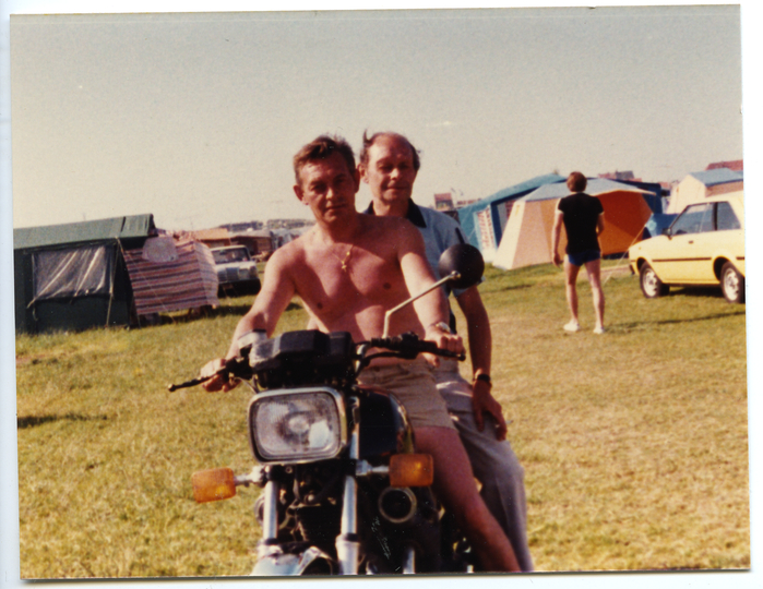 Roger Ponet met René Van Lancker (neven) op de motorfiets op de camping in Bredene, jaren 1970-1980.