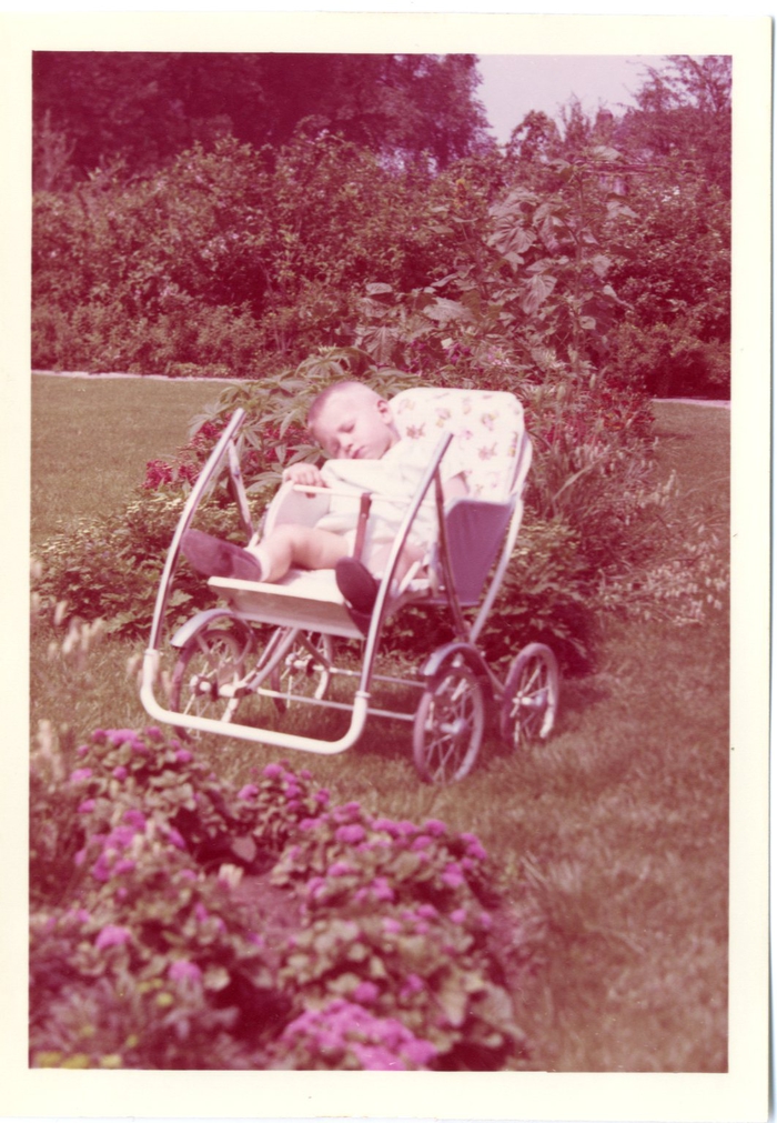Patrick Waeytens in de kinderwagen aan het slapen in het zonnetje in de tuin van zijn ouderkijk huis in Balegem.