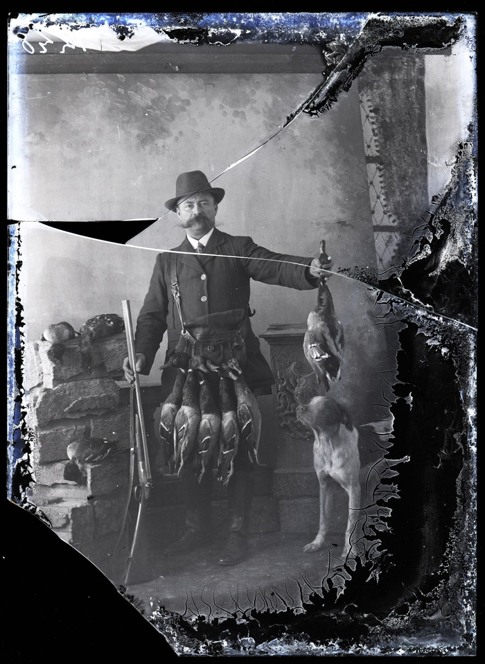 Studioportret van man met hoed en jagerskostuum, geweer, jachthond en jachttrofeeën, Melle, 1910-1920