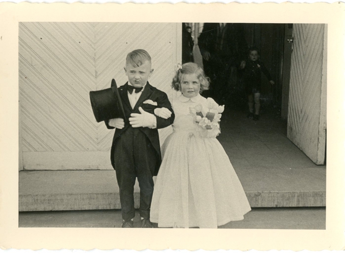 Monique De Moor en Luc Van De Weghe, eind jaren ’50 of begin jaren ’60. Ze dragen bruidskledij op een feest van het Ankerschooltje in de Parochiale Kring in Oosterzele.
