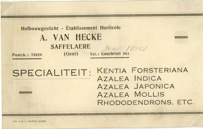 Visitekaartje van bloemisterij van Adolf Van Hecke, hij startte met bloemisten in 1893 en vestigde zich in 1906 in de Kerkstraat. De toenmalige specialiteiten staan erop vermeld.